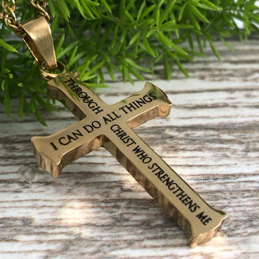 Philippians 4:13 Cross Necklace for Men Strength Bible Verse I CAN DO ALL THINGS Pendant Stainless Steel Chain Meaningful Jewelry Gift SSN541-G