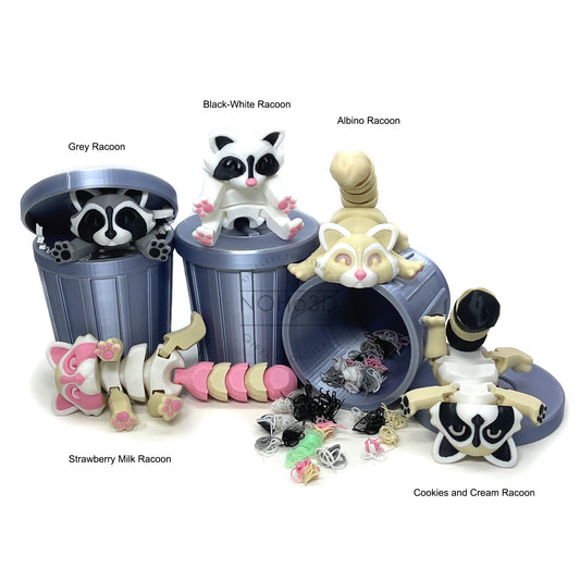 3D Printed Racoon with Trashcan, Articulated Cookies and Cream Trash Panda racoons, Tiny Animal Figures, Fidget ADHD Autism Toy AR005