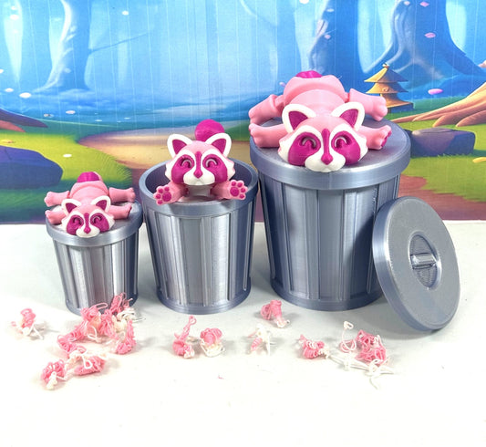 3pcs 3D Printed Racoon with Trashcan, Articulated Raspberry Trash Panda racoons, Tiny Animal Figures, Fidget ADHD Autism Toy AR006-SET