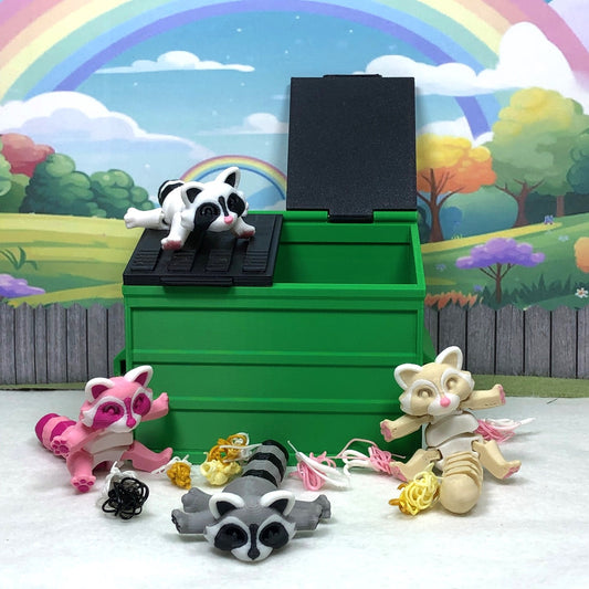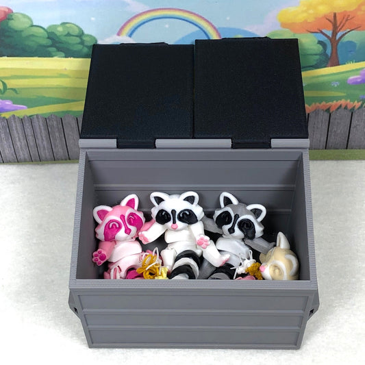4pcs 3D Printed Racoon with Dumpster Bin, Articulated Colorful Trash Panda Racoons, Tiny Animal Figures, Birthday Party Decorations AR002-DB
