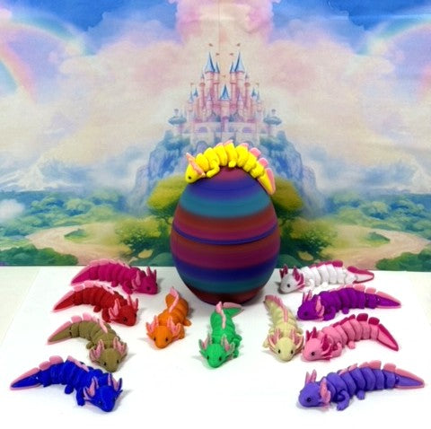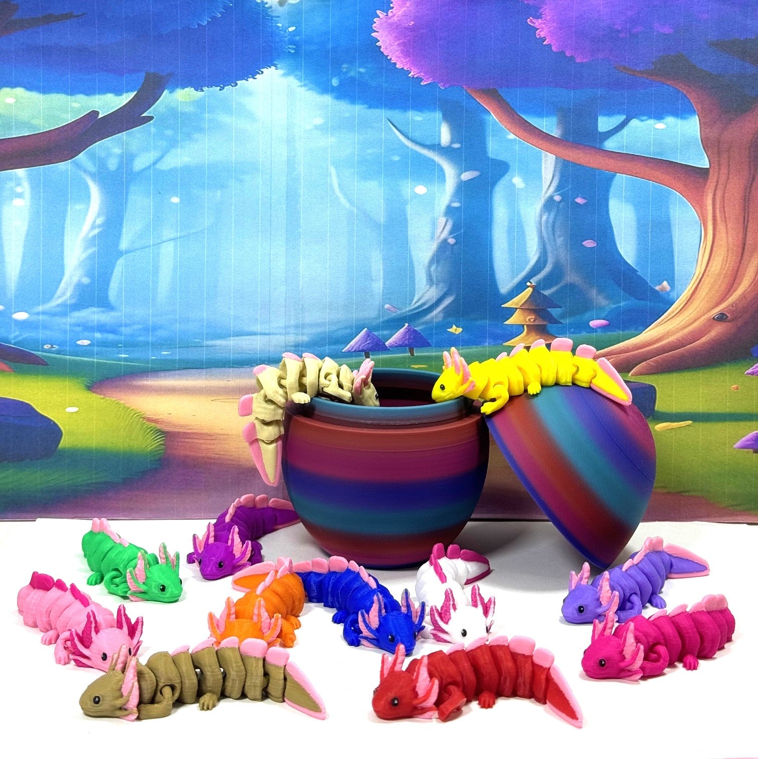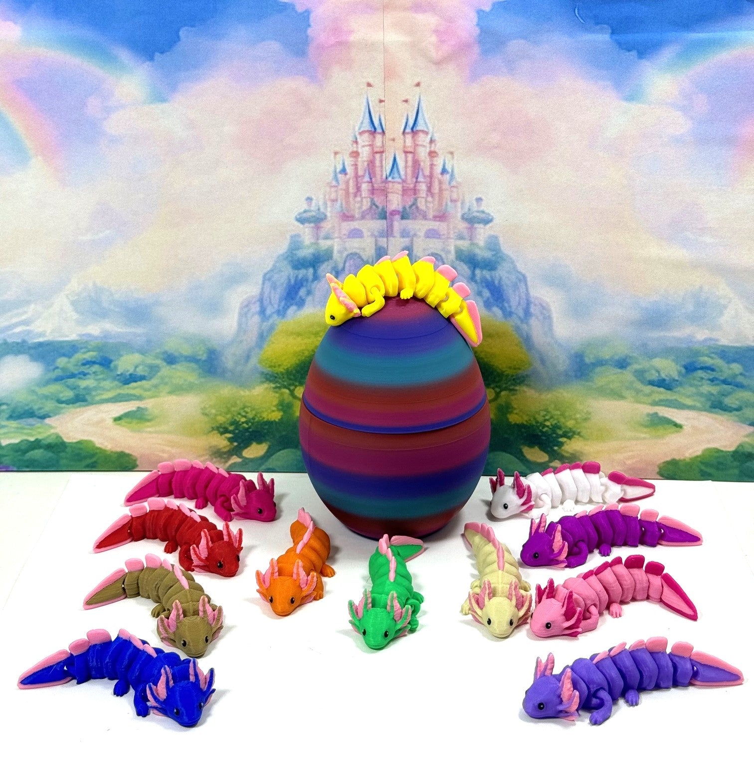 Introducing our 3D Printed ARTICULATED Baby Axolotl with Colorful Egg. Each baby Axolotl measures 3" long. These posable cuties are meticulously crafted with an eye for detail, this interactive desk accessory is not just a source of entertainment; it's also a stress-relieving toy and a chic decor piece for any space.