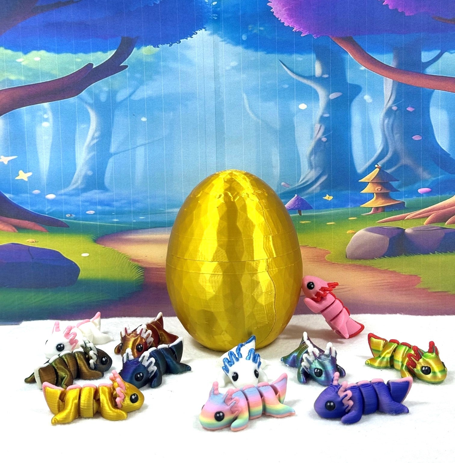 Introducing our 3D Printed ARTICULATED Baby Axolotl with Gold Hammered Egg. Each mini Axolotl measures 3" long. These posable mini Axolotl are meticulously crafted with an eye for detail, this interactive desk accessory is not just a source of entertainment; it's also a stress-relieving toy and a chic decor piece for any space.