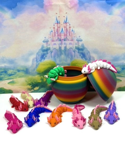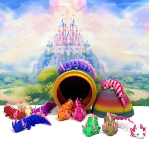 Introducing our 3D Printed ARTICULATED Baby Axolotl with Rainbow Egg. Each baby Axolotl measures 3" long. These posable cuties are meticulously crafted with an eye for detail, this interactive desk accessory is not just a source of entertainment; it's also a stress-relieving toy and a chic decor piece for any space.
