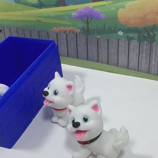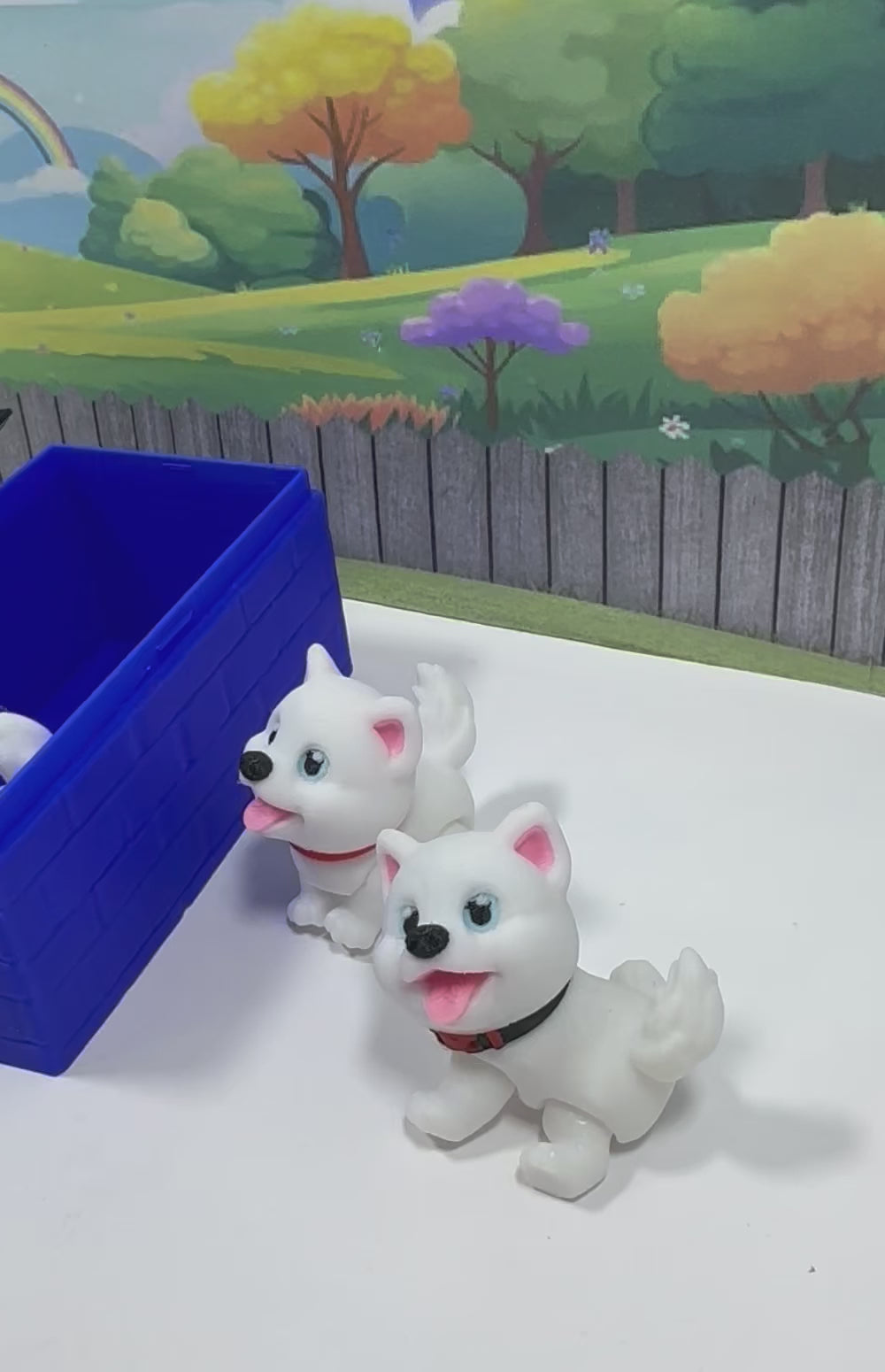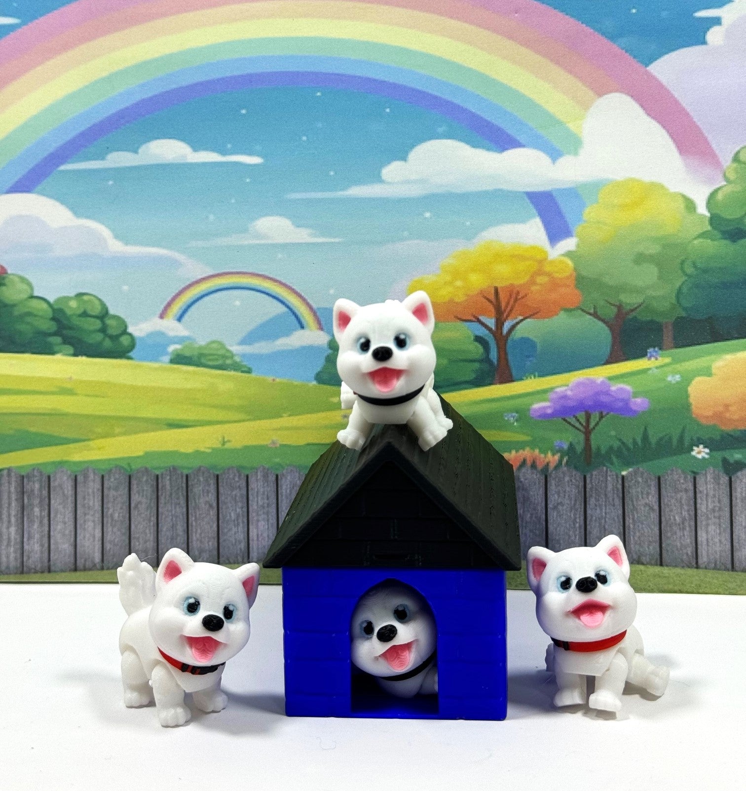 4pcs 3D Printed Dog with Dog House, Articulated Baby Husky Chibi Edition Toy, White Posable and Movable Head and Joints Animal, Fidget ADHD Autism Toy CH001-WHT-BH