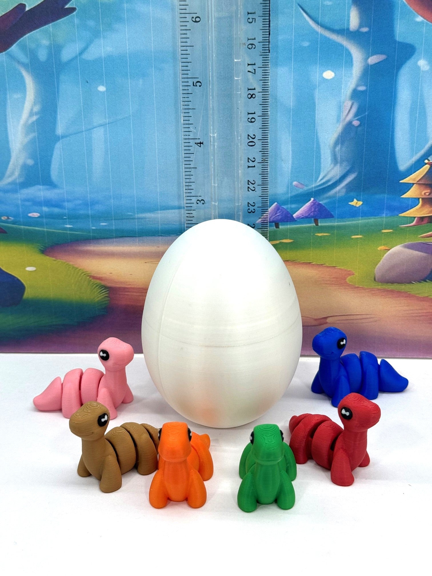 Introducing our 3D Printed Red ARTICULATED Mini Dinosaurs with egg. Each mini dinosaur measures approximately 1" long and comes in each own egg. These 7 pcs posable mini Brontosaurus Dinosaurs are meticulously crafted with an eye for detail, this interactive desk accessory is not just a source of entertainment; it's also a stress-relieving toy and a chic decor piece for any space.